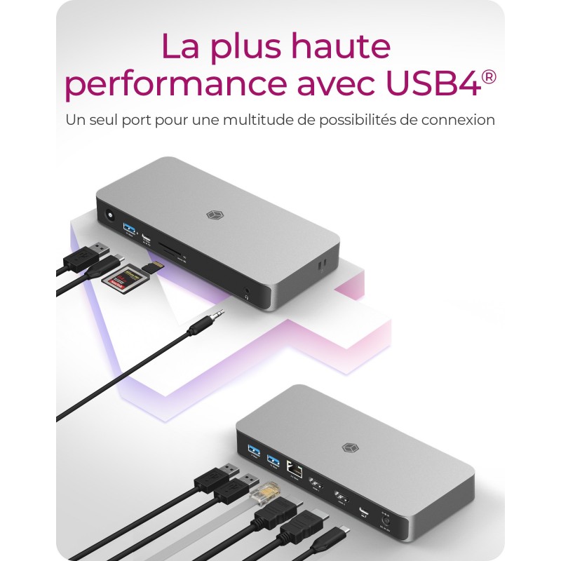 ICY BOX IB-DK2880-C41. Technologie de connectivité: Avec fil, Interface de l'hôte: USB4, Délivrance de la puissance USB jusqu’à: 100 W. LAN Ethernet : taux de transfert des données: 10,100,1000,2500 Mbit/s. Couleur du produit: Anthracite, Noir, Cartes mémoire compatibles: MicroSD (TransFlash), MicroSDHC, MicroSDXC, SD, SDHC, SDXC, Taux de transfert des données: 40 Gbit/s. Type de source d'alimentation: CC, Tension d'entrée AC: 100 - 240 V, Fréquence d'entrée AC: 50 - 60 Hz. Largeur: 190 mm, Profondeur: 90 mm, Hauteur: 25 mm