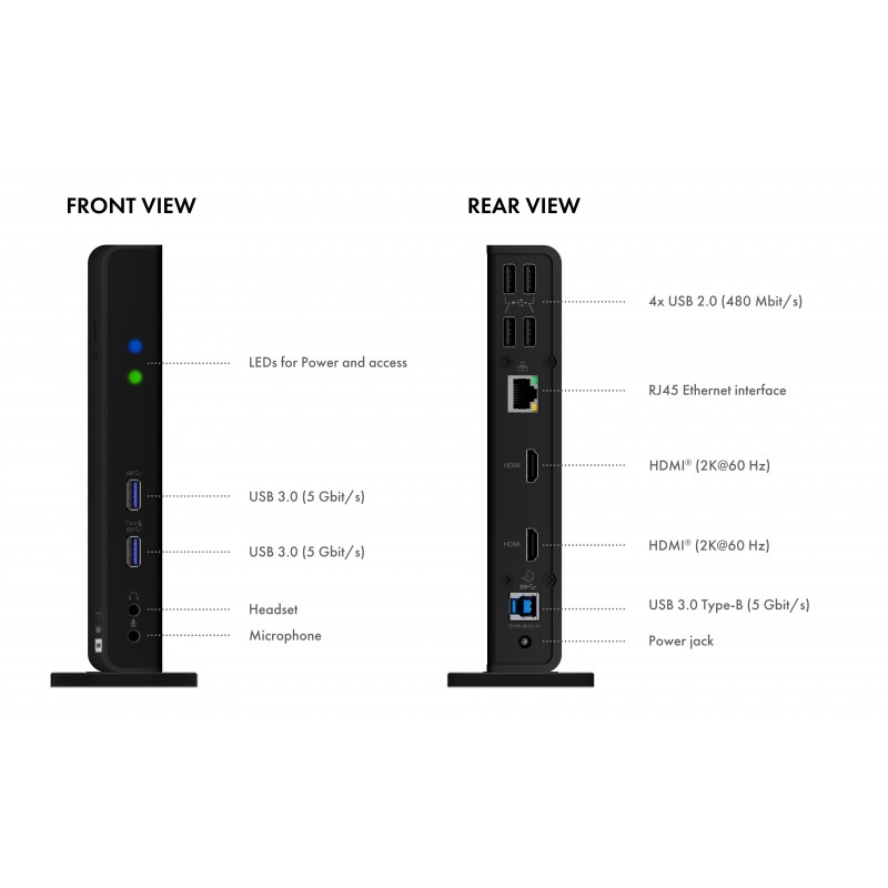 ICY BOX IB-DK2251AC. Technologie de connectivité: Avec fil, Interface de l'hôte: USB 3.2 Gen 2 (3.1 Gen 2) Type-A, Casque connection: 3,5 mm. LAN Ethernet : taux de transfert des données: 10,100,1000 Mbit/s. Couleur du produit: Noir, Taux de transfert des données: 5 Gbit/s, Type HD: Full HD. Type de source d'alimentation: CC, Tension d'entrée AC: 100-240 V, Fréquence d'entrée AC: 50 - 60 Hz. Largeur: 182 mm, Profondeur: 78 mm, Hauteur: 30 mm