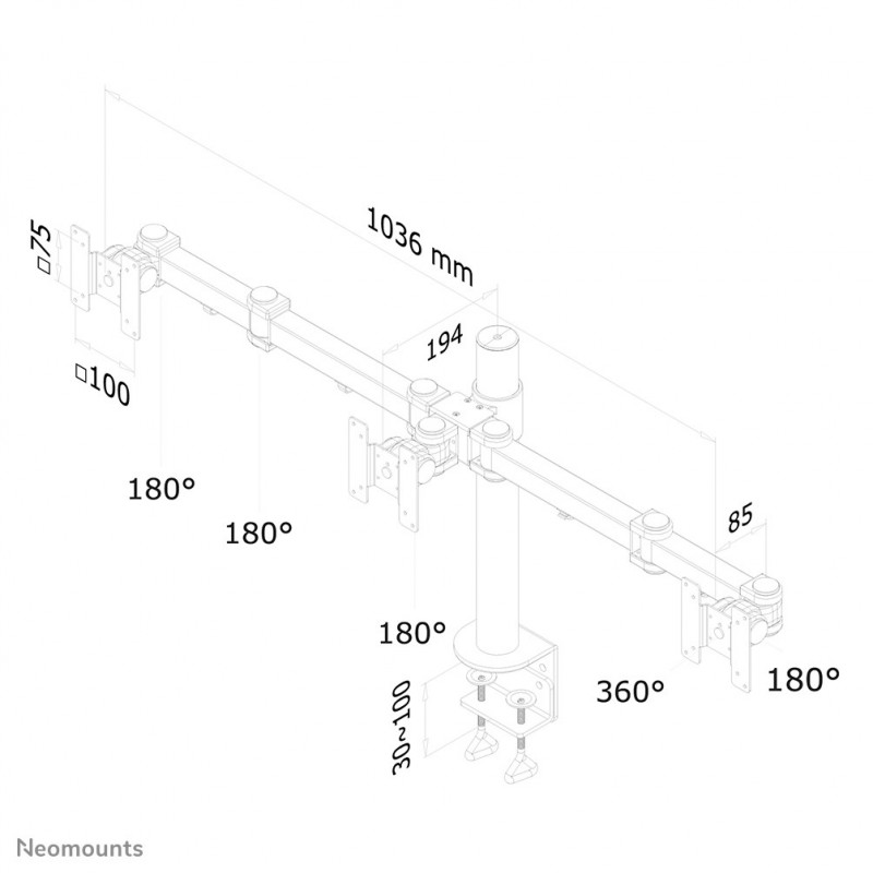 Neomounts FPMA-D960D3 Support d'écran à fixer 10-21". Montage: Pince, Capacité de charge maximale: 6 kg, Taille minimale de l'écran: 25,4 cm (10"), Taille maximale de l’écran: 53,3 cm (21"), Compatibilité interface de montage (min): 75 x 75 mm, Compatibilité interface de montage (max): 100 x 100 mm. Réglage de la hauteur, Plage de l'angle d'oscillation: 0 - 180°, Angle d'inclinaison: 0 - 180°. Couleur du produit: Noir