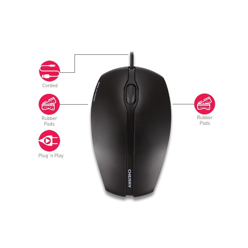CHERRY GENTIX CORDED ILLUMINATED MOUSE, Souris rétroéclairée, noir, USB. Format: Ambidextre. Technologie de détecteur de mouvement: Optique, Interface de l'appareil: USB Type-A, Résolution en mouvement: 1000 DPI, Type de boutons: Boutons poussoirs, Quantité de boutons programmables: 3, Type Scroll: Roue. Source d'alimentation: Cable. Couleur du produit: Noir