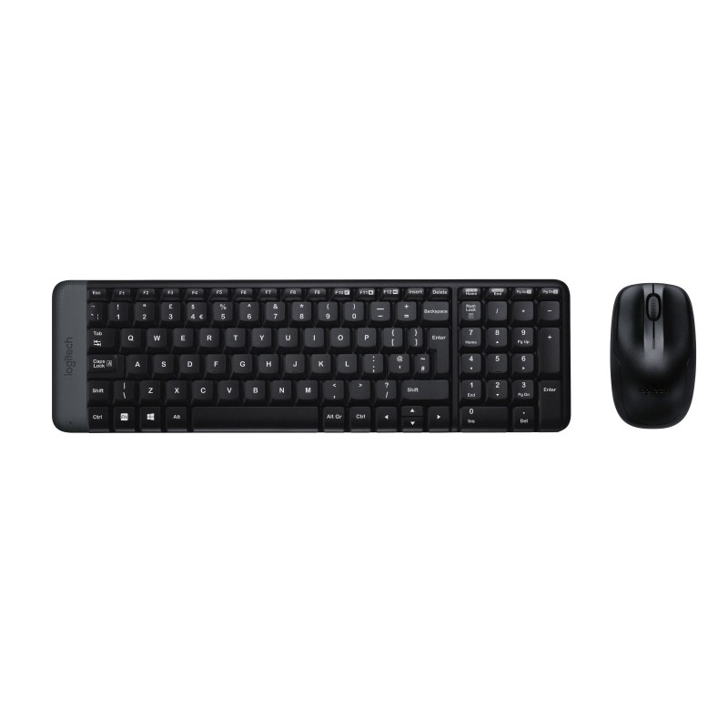 Logitech MK220. Facteur de forme du clavier: Mini. Style de clavier: Droit. Technologie de connectivité: Sans fil, Interface de l'appareil: RF sans fil, Disposition des touches du clavier: QWERTY, Utilisation recommandée: Bureau. Couleur du produit: Noir. Souris incluse
