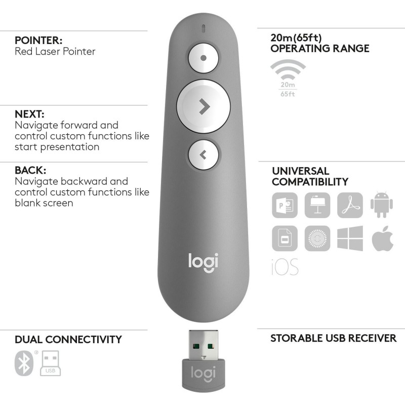 • Logitech R500, BluetoothRF, USB, 20 m, Gris