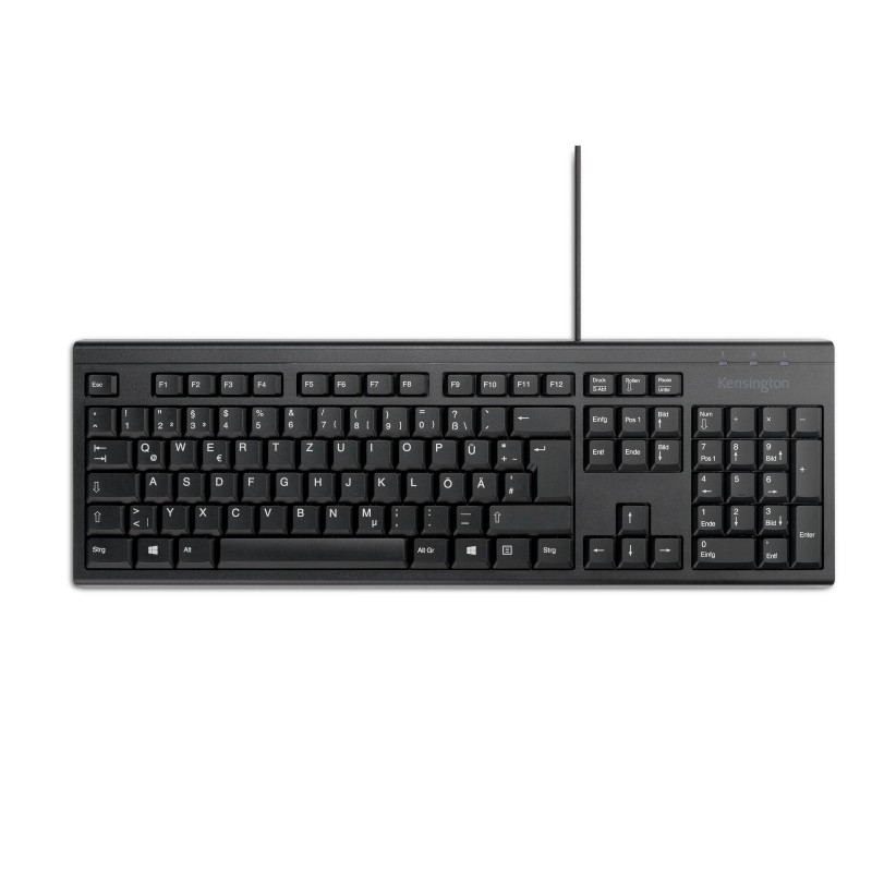 Kensington KB100 EQ Clavier filaire. Facteur de forme du clavier: Taille réelle (100 %), Technologie de connectivité: Avec fil, Interface de l'appareil: USB, Interrupteur à clé de clavier: Clavier à membrane, Disposition des touches du clavier: QWERTZ, Utilisation recommandée: maison/bureau. Couleur du produit: Noir