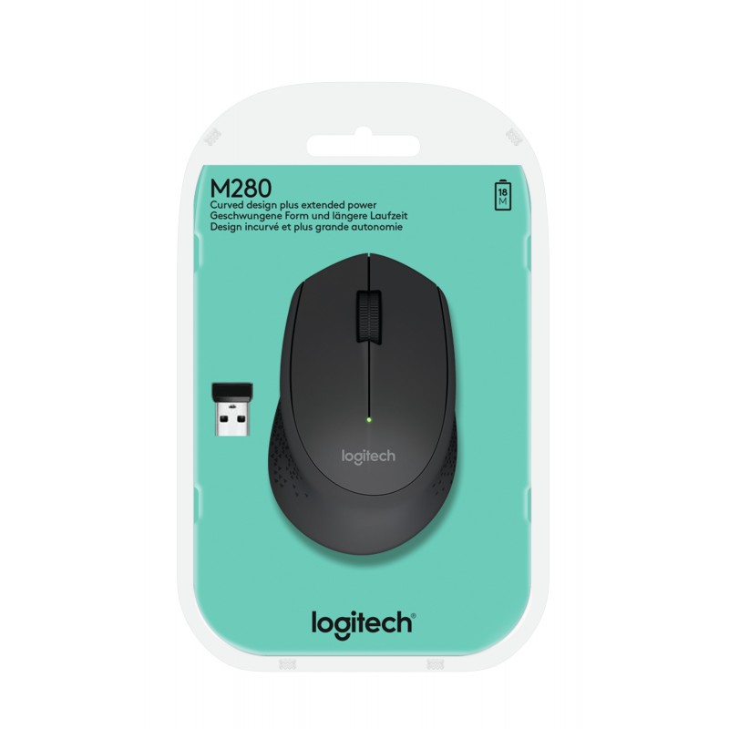 Logitech M280. Format: Droitier. Technologie de détecteur de mouvement: Optique, Interface de l'appareil: RF sans fil, Résolution en mouvement: 1000 DPI, Type de boutons: Boutons poussoirs, Quantité de boutons programmables: 3, Type Scroll: Roue. Source d'alimentation: Piles. Couleur du produit: Noir