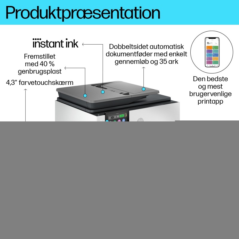 HP OfficeJet Pro Par 9132e Sans fil All-in-One Couleur Imprimante, Instant Ink; Impression recto-verso. Technologie d'impression: A jet d'encre thermique, Impression: Impression couleur, Résolution maximale: 4800 x 1200 DPI, Vitesse d'impression (couleur, qualité normale, A4/US Letter): 20 ppm. Copier: Copie couleur, Résolution max. des copies: 600 x 600 DPI. Numérisation: Numérisation couleur, Résolution de numérisation optique: 1200 x 1200 DPI. Télécopier: Télécopie couleur. Fonctions recto verso: Impression, Numérisation, Télécopie. Taille de papier de série A ISO maximum: A4. Wifi. Impression directe. Couleur du produit: Gris