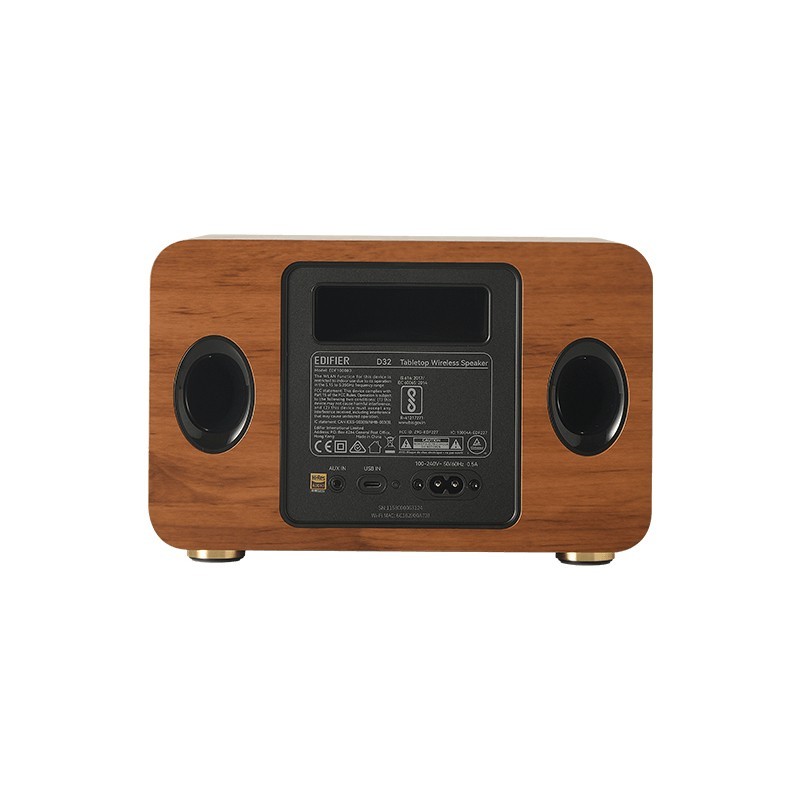 Edifier D32. Canaux de sortie audio: 2.1 canaux, Diamètre de haut parleur aigu (impérial): 2,54 cm (1"). Puissance évaluée de RMS: 60 W, Puissance en RMS du tweeter: 30 W, Gamme de fréquence: 52 - 40000 Hz. Technologie de connectivité: Avec fil &sans fil, Plage de fréquence: 2,402 - 2,48 GHz, Connecteur USB: USB Type-C. Type de produit: Système d’enceinte portable 2.1, Couleur du produit: Marron, Commande de volume: Boutons. Utilisation recommandée: Universel, Formats audio pris en charge: AAC, ALAC, SBC