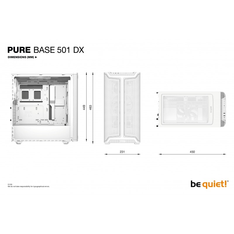 be quiet! Pure Base 501 Blanc | Boîtier PC vitré, Mini ATX / Micro ATX / ATX, 3 ventilateurs Pure Wings 3 140 mm PWM, bande ARGB. Format: Midi Tower, Type: PC, Couleur du produit: Blanc. Facteurs de forme d'alimentation pris en charge: ATX, PS2. Ventilateurs installés avant: 1x 140 mm, Prise en charge des diamètres des ventilateurs avants: 120,140 mm, Ventilateurs arrières installés: 1x 140 mm. Tailles de disques durs supportées: 2.5,3.5". Largeur: 231 mm, Profondeur: 450 mm, Hauteur: 463 mm
