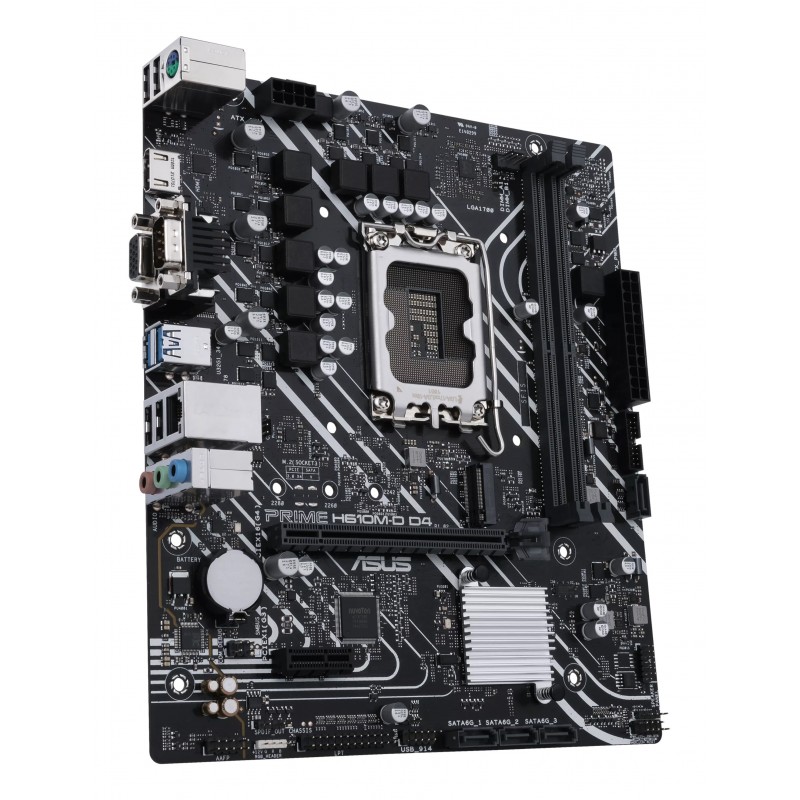 ASUS PRIME H610M-D D4. Fabricant de processeur: Intel, Socket de processeur (réceptable de processeur): LGA 1700, Processeurs compatibles: Intel® Celeron®, Intel® Core™ i3, Intel® Core™ i5, Intel® Core™ i7, Intel® Core™ i9,.... Types de mémoire pris en charge: DDR4-SDRAM, Mémoire interne maximale: 64 Go, Type de support (slot): DIMM. Interfaces de lecteur de stockage prises en charge: M.2, SATA, Types de lecteurs de stockage pris en charge: HDD & SSD. Type d'interface Ethernet: Gigabit Ethernet. composant pour: PC, Elément de forme de carte mère: micro ATX, famille de composant de produits: Intel