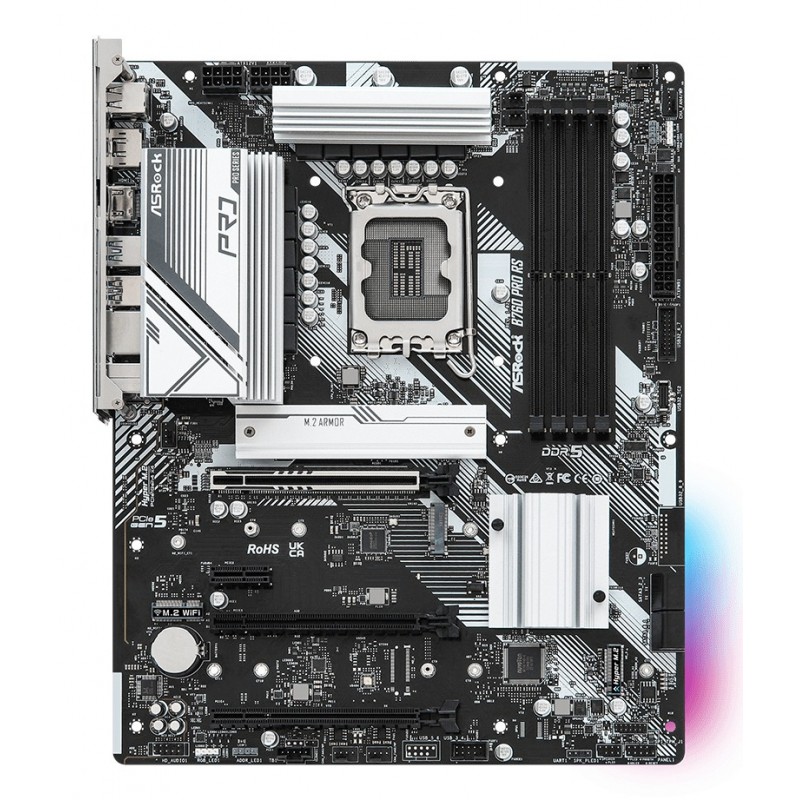 Asrock B760 PRO RS. Fabricant de processeur: Intel, Socket de processeur (réceptable de processeur): LGA 1700, Processeurs compatibles: Intel® Core™ i3, Intel® Core™ i5, Intel® Core™ i7, Intel® Core™ i9. Types de mémoire pris en charge: DDR5-SDRAM, Mémoire interne maximale: 128 Go, Type de support (slot): DIMM. Interfaces de lecteur de stockage prises en charge: M.2, PCI Express 4.0, SATA III, Types de lecteurs de stockage pris en charge: SSD, Niveaux RAID: 0, 1, 5, 10. Famille d'adaptateur graphique: Intel, Modèle d'adaptateur graphique inclus: Intel Iris Xe Graphics. Type d'interface Ethernet: 2.5 Gigabit Ethernet, Contrôleur de réseau local (LAN): Realtek RTL8125-BG