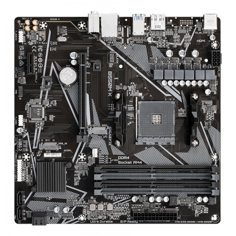 GIGABYTE B550M K Carte mère - Processeurs AMD Ryzen 5000, jusqu'à 4733 MHz DDR4, 1xPCIe 4.0 + 1xPCIe 3.0 M.2, LAN 1GbE, USB 3.2 Gen 1. Fabricant de processeur: AMD, Socket de processeur (réceptable de processeur): Emplacement AM4, Processeurs compatibles: AMD Ryzen 3000 Series, AMD Ryzen 4000 Series, AMD Ryzen 5000 Series. Types de mémoire pris en charge: DDR4-SDRAM, Mémoire interne maximale: 128 Go, Type de support (slot): DIMM. Interfaces de lecteur de stockage prises en charge: M.2, SATA, Types de lecteurs de stockage pris en charge: HDD & SSD, Niveaux RAID: 0, 1, 10. Résolution maximale: 5120 x 2880 pixels. Type d'interface Ethernet: Gigabit Ethernet, Contrôleur de réseau local (LAN): Realtek RTL8111H