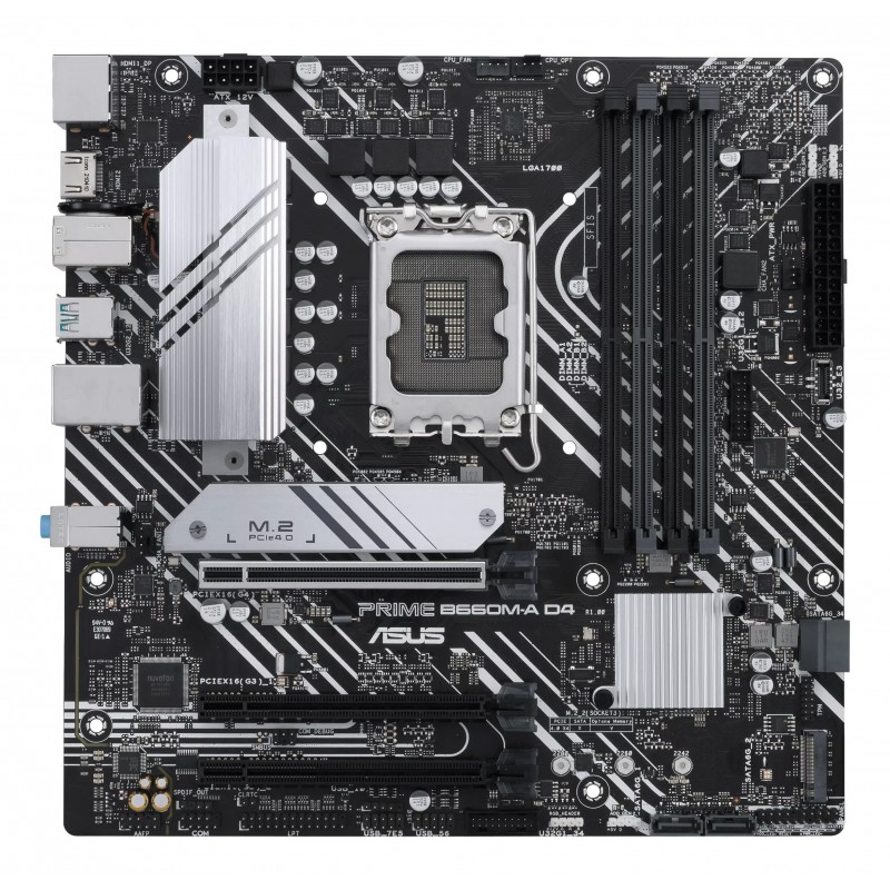 ASUS PRIME B660M-A D4-CSM. Fabricant de processeur: Intel, Socket de processeur (réceptable de processeur): LGA 1700, Processeurs compatibles: Intel® Celeron®, Intel® Core™ i3, Intel® Core™ i5, Intel® Core™ i7, Intel® Core™ i9,.... Types de mémoire pris en charge: DDR4-SDRAM, Mémoire interne maximale: 128 Go, Type de support (slot): DIMM. Interfaces de lecteur de stockage prises en charge: M.2, SATA III, Types de lecteurs de stockage pris en charge: HDD & SSD, Niveaux RAID: 0, 1, 5, 10. Type d'interface Ethernet: Gigabit Ethernet. composant pour: PC, Elément de forme de carte mère: micro ATX, famille de composant de produits: Intel