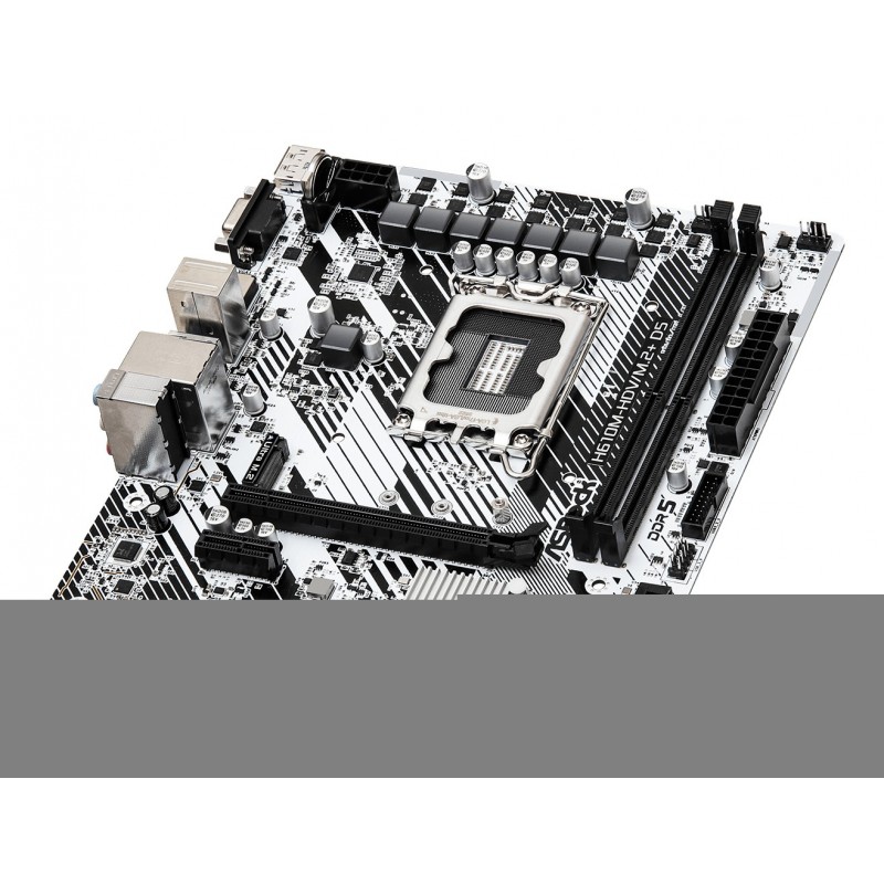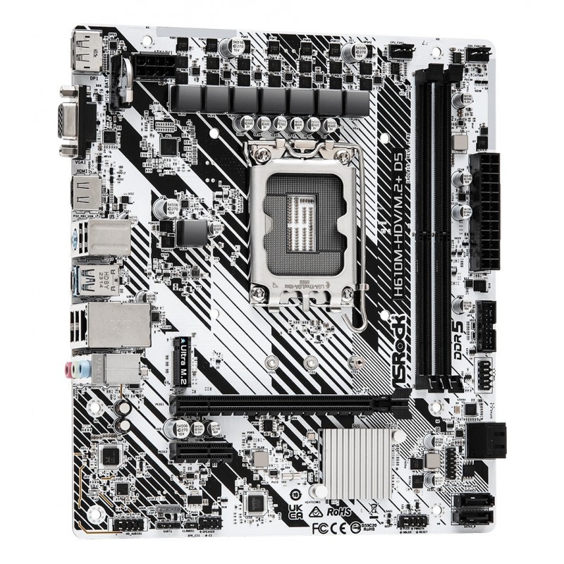 Asrock H610M-HDV/M.2+ D5. Fabricant de processeur: Intel, Socket de processeur (réceptable de processeur): LGA 1700. Types de mémoire pris en charge: DDR5-SDRAM, Mémoire interne maximale: 96 Go, Type de support (slot): DIMM. Interfaces de lecteur de stockage prises en charge: SATA III. Type d'interface Ethernet: Gigabit Ethernet, Contrôleur de réseau local (LAN): Realtek RTL8111H. composant pour: PC, Elément de forme de carte mère: micro ATX, famille de composant de produits: Intel