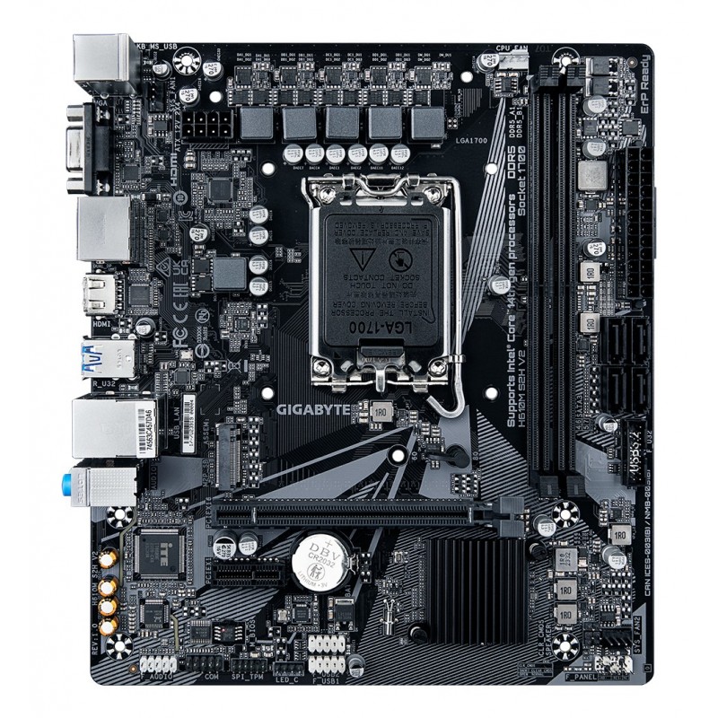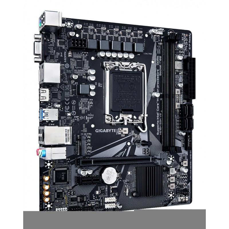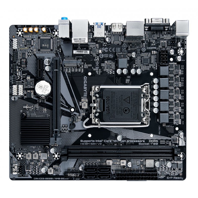 GIGABYTE H610M S2H V2 Carte mère - Prend en charge les processeurs Intel Core 14e génération, VRM numérique hybride 4+1+1 phases, jusqu'à 5600MHz DDR5, 1xPCIe 3.0 M.2, LAN GbE, USB 3.2 Gen 1. Fabricant de processeur: Intel, Socket de processeur (réceptable de processeur): LGA 1700, Processeurs compatibles: Intel® Celeron®, Intel® Core™ i3, Intel® Core™ i5, Intel® Core™ i7, Intel® Core™ i9,.... Types de mémoire pris en charge: DDR5-SDRAM, Mémoire interne maximale: 96 Go, Type de support (slot): DIMM. Interfaces de lecteur de stockage prises en charge: M.2, SATA, Types de lecteurs de stockage pris en charge: HDD & SSD. Famille d'adaptateur graphique: Intel, Adaptateur graphique: HD Graphics, Résolution maximale: 4096 x 2304 pixels. Type d'interface Ethernet: Gigabit Ethernet