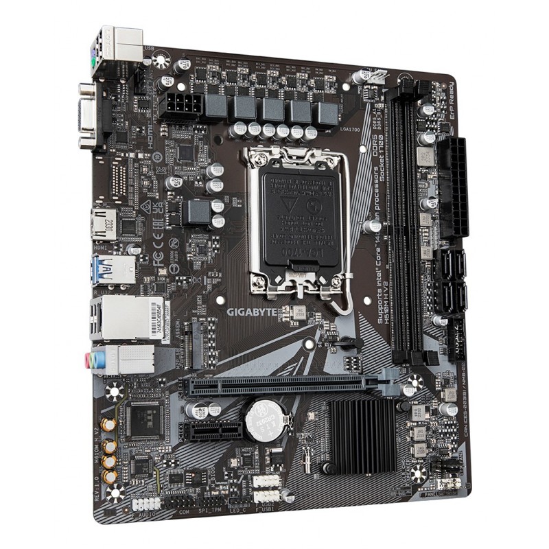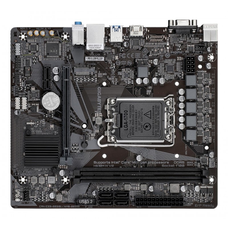 GIGABYTE H610M H V2 Carte mère - Compatible avec processeurs Intel Core 14th CPUs, 4+1+1 Hybrid Digital VRM, up to 5600MHz DDR5, 1xPCIe 3.0 M.2, GbE LAN, USB 3.2 Gen 1. Fabricant de processeur: Intel, Socket de processeur (réceptable de processeur): LGA 1700, Processeurs compatibles: Intel® Celeron®, Intel® Core™ i3, Intel® Core™ i5, Intel® Core™ i7, Intel® Core™ i9,.... Types de mémoire pris en charge: DDR5-SDRAM, Mémoire interne maximale: 96 Go, Type de support (slot): DIMM. Interfaces de lecteur de stockage prises en charge: M.2, SATA III, Types de lecteurs de stockage pris en charge: HDD & SSD. Famille d'adaptateur graphique: Intel, Adaptateur graphique: HD Graphics, Résolution maximale: 4096 x 2304 pixels. Connecteur USB: USB Type-A