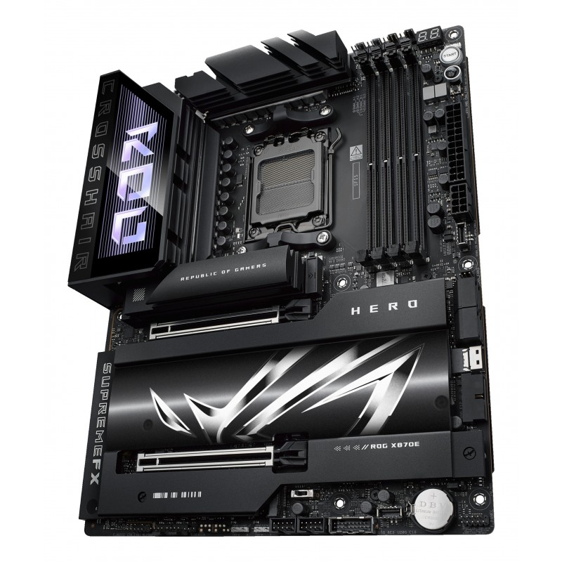 ASUS ROG CROSSHAIR X870E HERO. Fabricant de processeur: AMD, Socket de processeur (réceptable de processeur): Emplacement AM5, Prise en charge des douilles du processeur: Emplacement AM5. Types de mémoire pris en charge: DDR5-SDRAM, Mémoire interne maximale: 192 Go, Type de support (slot): DIMM. Interfaces de lecteur de stockage prises en charge: M.2, SATA III, SlimSAS, Types de lecteurs de stockage pris en charge: HDD & SSD, Niveaux RAID: 0, 1, 10, 5. Type d'interface Ethernet: 2.5 Gigabit Ethernet, 5 Gigabit Ethernet, Norme Wi-Fi: Wi-Fi 7 (802.11be), Standards wifi: Wi-Fi 7 (802.11be). composant pour: PC, Elément de forme de carte mère: ATX, famille de composant de produits: AMD