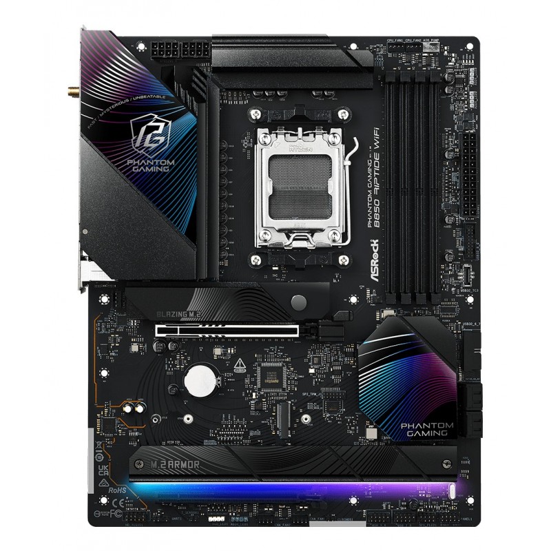 Asrock Phantom Gaming B850 Riptide WiFi. Fabricant de processeur: AMD, Socket de processeur (réceptable de processeur): Emplacement AM5, Processeurs compatibles: AMD Ryzen 7000 Series, AMD Ryzen 8000 Series, AMD Ryzen 9000 Series. Types de mémoire pris en charge: DDR5-SDRAM, Mémoire interne maximale: 256 Go, Type de support (slot): DIMM. Interfaces de lecteur de stockage prises en charge: PCI Express 4.0, PCI Express 5.0, SATA III, Types de lecteurs de stockage pris en charge: HDD & SSD, Niveaux RAID: 0, 1, 10. Résolution maximale: 3840 x 2160 pixels. Connecteur USB: USB Type-A, USB Type-C