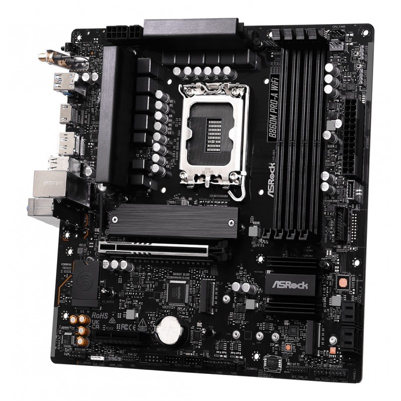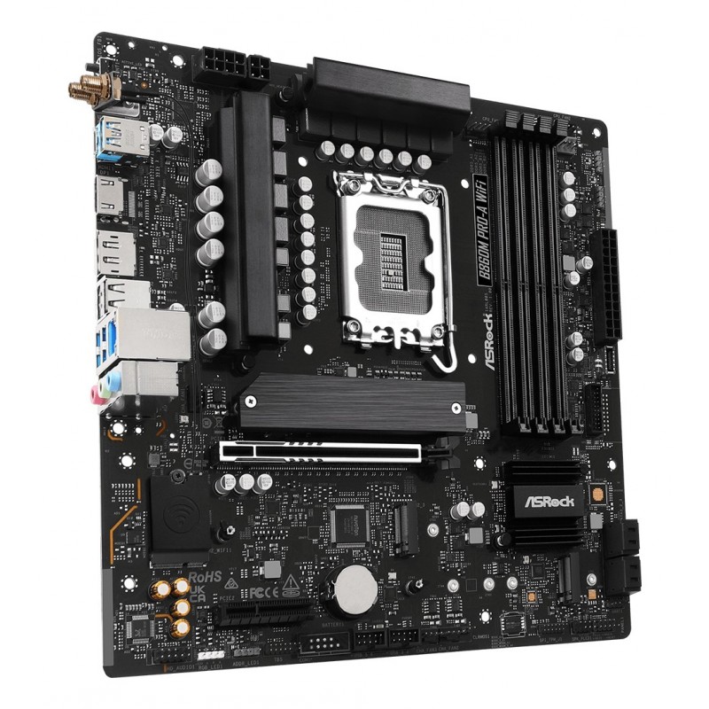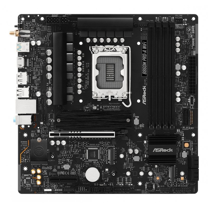 Asrock B860M Pro-A WiFi. Fabricant de processeur: Intel, Socket de processeur (réceptable de processeur): LGA 1851 (Socket V1). Types de mémoire pris en charge: DDR5-SDRAM, Mémoire interne maximale: 256 Go, Type de support (slot): DIMM. Interfaces de lecteur de stockage prises en charge: M.2, SATA III, Types de lecteurs de stockage pris en charge: HDD & SSD, Niveaux RAID: 0, 5, 10. Type d'interface Ethernet: 2.5 Gigabit Ethernet, Contrôleur de réseau local (LAN): Dragon RTL8125BG, Norme Wi-Fi: Wi-Fi 6E (802.11ax). composant pour: PC, Elément de forme de carte mère: micro ATX, famille de composant de produits: Intel