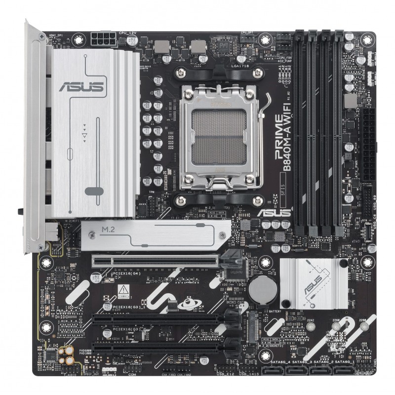 ASUS PRIME B840M-A WIFI. Fabricant de processeur: AMD, Socket de processeur (réceptable de processeur): Emplacement AM5, Processeurs compatibles: AMD Ryzen 7000 Series, AMD Ryzen 8000 Series, AMD Ryzen 9000 Series. Types de mémoire pris en charge: DDR5-SDRAM, Mémoire interne maximale: 192 Go, Type de support (slot): DIMM. Interfaces de lecteur de stockage prises en charge: M.2, SATA III, Types de lecteurs de stockage pris en charge: HDD & SSD, Niveaux RAID: 0, 1, 5, 10. Type d'interface Ethernet: 2.5 Gigabit Ethernet, Norme Wi-Fi: Wi-Fi 6E (802.11ax), Standards wifi: Wi-Fi 6E (802.11ax). composant pour: PC, Elément de forme de carte mère: micro ATX, famille de composant de produits: AMD