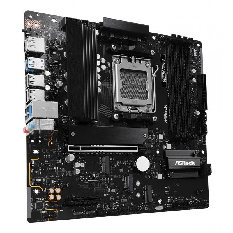 Asrock B850M Pro-A. Fabricant de processeur: AMD, Socket de processeur (réceptable de processeur): Emplacement AM5, Processeurs compatibles: AMD Ryzen 7000 Series, AMD Ryzen 8000 Series, AMD Ryzen 9000 Series. Types de mémoire pris en charge: DDR5-SDRAM, Mémoire interne maximale: 256 Go, Type de support (slot): DIMM. Interfaces de lecteur de stockage prises en charge: PCI Express 4.0, PCI Express 5.0, SATA III, Types de lecteurs de stockage pris en charge: HDD & SSD, Niveaux RAID: 0, 1, 10. Résolution maximale: 3840 x 2160 pixels. Connecteur USB: USB Type-A, USB Type-C