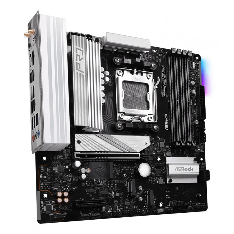 Asrock B850M Pro RS WiFi. Fabricant de processeur: AMD, Socket de processeur (réceptable de processeur): Emplacement AM5, Processeurs compatibles: AMD Ryzen 7000 Series, AMD Ryzen 8000 Series, AMD Ryzen 9000 Series. Types de mémoire pris en charge: DDR5-SDRAM, Mémoire interne maximale: 256 Go, Type de support (slot): DIMM. Interfaces de lecteur de stockage prises en charge: PCI Express 4.0, PCI Express 5.0, SATA III, Types de lecteurs de stockage pris en charge: HDD & SSD, Niveaux RAID: 0, 1, 10. Résolution maximale: 3840 x 2160 pixels. Connecteur USB: USB Type-A, USB Type-C