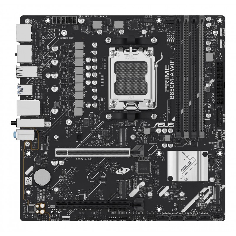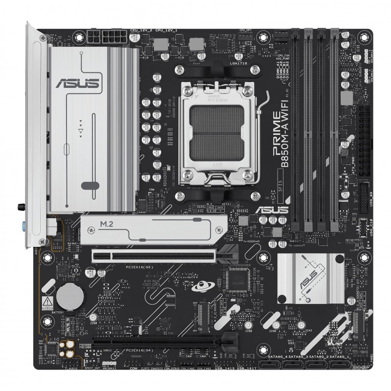 ASUS PRIME B850M-A WIFI. Fabricant de processeur: AMD, Socket de processeur (réceptable de processeur): Emplacement AM5, Processeurs compatibles: AMD Ryzen 7000 Series, AMD Ryzen 8000 Series, AMD Ryzen 9000 Series. Types de mémoire pris en charge: DDR5-SDRAM, Mémoire interne maximale: 256 Go, Type de support (slot): DIMM. Interfaces de lecteur de stockage prises en charge: M.2, SATA III, Types de lecteurs de stockage pris en charge: HDD & SSD, Niveaux RAID: 0, 1, 5, 10. Type d'interface Ethernet: 2.5 Gigabit Ethernet, Fast Ethernet, Gigabit Ethernet, Norme Wi-Fi: Wi-Fi 6E (802.11ax). composant pour: PC, Elément de forme de carte mère: micro ATX, famille de composant de produits: AMD
