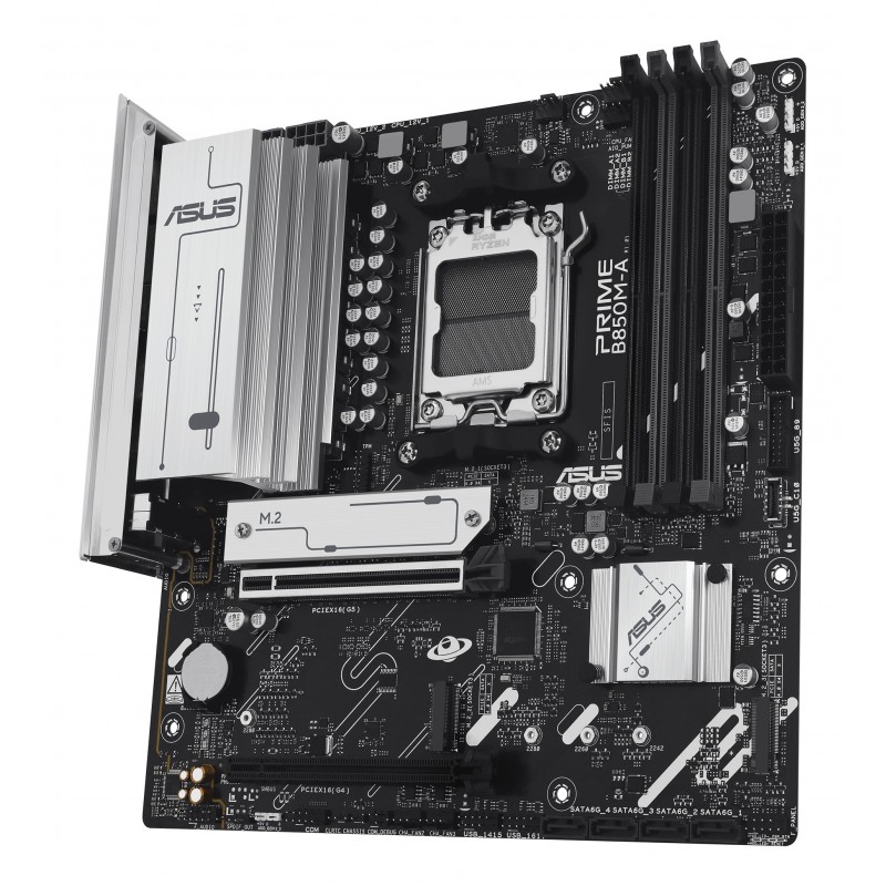 ASUS PRIME B850M-A-CSM. Fabricant de processeur: AMD, Socket de processeur (réceptable de processeur): Emplacement AM5, Processeurs compatibles: AMD Ryzen 7000 Series, AMD Ryzen 8000 Series, AMD Ryzen 9000 Series. Types de mémoire pris en charge: DDR5-SDRAM, Mémoire interne maximale: 256 Go, Type de support (slot): DIMM. Interfaces de lecteur de stockage prises en charge: PCI Express 4.0, PCI Express 5.0, Types de lecteurs de stockage pris en charge: HDD & SSD, Niveaux RAID: 0, 1, 5, 10. Résolution maximale: 7680 x 4320 pixels. Type d'interface Ethernet: 2.5 Gigabit Ethernet