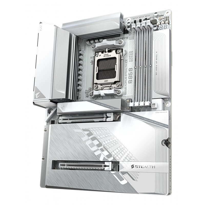 GIGABYTE B850 AORUS STEALTH ICE Carte Mère – Processeurs AMD Ryzen série 9000, VRM numérique 14+2+2 phases, jusqu’à 8200 MHz DDR5 (OC), 2 x M.2 PCIe 5.0 + 2 x PCIe 4.0, Wi-Fi 7, LAN 5 GbE, USB 3.2 Gen 2. Fabricant de processeur: AMD, Socket de processeur (réceptable de processeur): Emplacement AM5, Processeurs compatibles: AMD Ryzen 7000 Series, AMD Ryzen 8000 Series, AMD Ryzen 9000 Series. Types de mémoire pris en charge: DDR5-SDRAM, Mémoire interne maximale: 256 Go, Type de support (slot): DIMM. Interfaces de lecteur de stockage prises en charge: M.2, PCI Express 4.0, PCI Express 5.0, SATA III, Types de lecteurs de stockage pris en charge: HDD & SSD, Niveaux RAID: 0, 1, 5, 10. Résolution maximale: 4096 x 2160 pixels. Type d'interface Ethernet: 5 Gigabit Ethernet, Contrôleur de réseau local (LAN): Realtek RTL8126, Norme Wi-Fi: Wi-Fi 7 (802.11be)