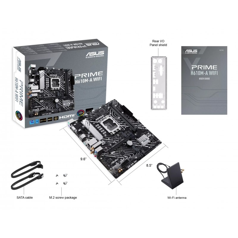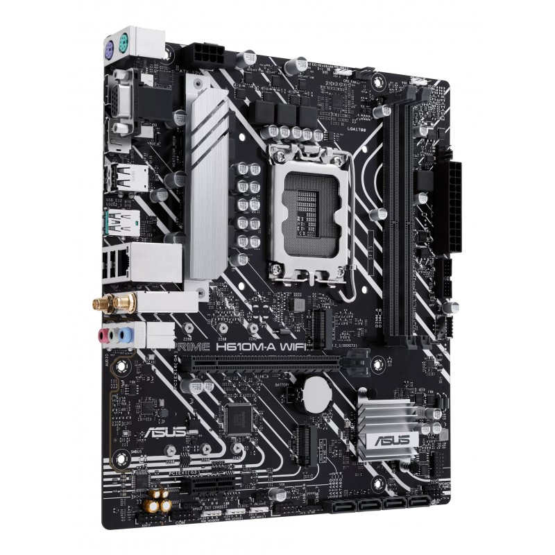 ASUS PRIME H610M-A WIFI. Fabricant de processeur: Intel, Socket de processeur (réceptable de processeur): LGA 1700, Processeurs compatibles: Intel® Celeron®, Intel® Pentium® Gold, Intel® Core™ i3, Intel® Core™ i5, Intel® Core™.... Types de mémoire pris en charge: DDR5-SDRAM, Mémoire interne maximale: 96 Go, Type de support (slot): DIMM. Interfaces de lecteur de stockage prises en charge: M.2, SATA III, Types de lecteurs de stockage pris en charge: HDD & SSD. Type d'interface Ethernet: Gigabit Ethernet, Norme Wi-Fi: Wi-Fi 5 (802.11ac), Standards wifi: 802.11a, 802.11b, 802.11g, Wi-Fi 4 (802.11n), Wi-Fi 5 (802.11ac). composant pour: PC, Elément de forme de carte mère: micro ATX, famille de composant de produits: Intel