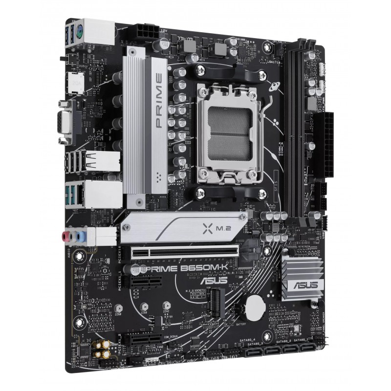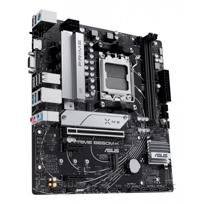 ASUS PRIME B650M-K. Fabricant de processeur: AMD, Socket de processeur (réceptable de processeur): Emplacement AM5, Processeurs compatibles: AMD Ryzen 7000 Series. Types de mémoire pris en charge: DDR5-SDRAM, Mémoire interne maximale: 96 Go, Type de support (slot): DIMM. Interfaces de lecteur de stockage prises en charge: M.2, SATA III, Types de lecteurs de stockage pris en charge: HDD & SSD, Niveaux RAID: 0, 1, 10. Type d'interface Ethernet: 2.5 Gigabit Ethernet. composant pour: PC, Elément de forme de carte mère: micro ATX, famille de composant de produits: AMD