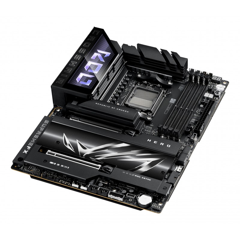 ASUS ROG CROSSHAIR X870E HERO. Fabricant de processeur: AMD, Socket de processeur (réceptable de processeur): Emplacement AM5, Prise en charge des douilles du processeur: Emplacement AM5. Types de mémoire pris en charge: DDR5-SDRAM, Mémoire interne maximale: 192 Go, Type de support (slot): DIMM. Interfaces de lecteur de stockage prises en charge: M.2, SATA III, SlimSAS, Types de lecteurs de stockage pris en charge: HDD & SSD, Niveaux RAID: 0, 1, 10, 5. Type d'interface Ethernet: 2.5 Gigabit Ethernet, 5 Gigabit Ethernet, Norme Wi-Fi: Wi-Fi 7 (802.11be), Standards wifi: Wi-Fi 7 (802.11be). composant pour: PC, Elément de forme de carte mère: ATX, famille de composant de produits: AMD