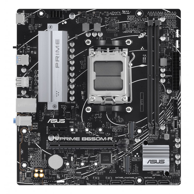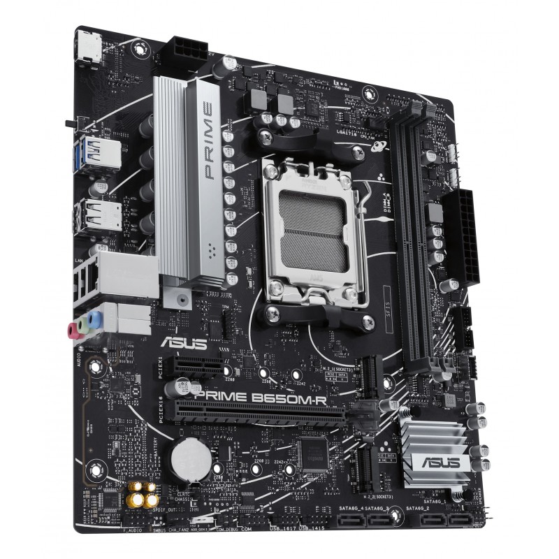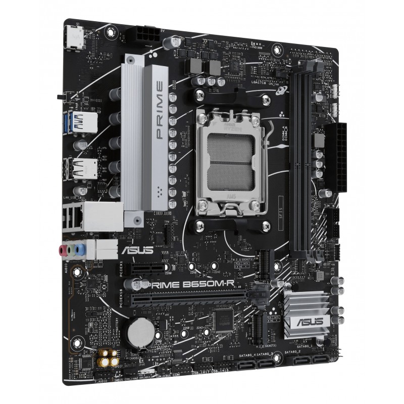 ASUS PRIME B650M-R. Fabricant de processeur: AMD, Socket de processeur (réceptable de processeur): Emplacement AM5, Processeurs compatibles: AMD Ryzen 8000 Series, AMD Ryzen 7000 Series. Types de mémoire pris en charge: DDR5-SDRAM, Mémoire interne maximale: 96 Go, Type de support (slot): DIMM. Interfaces de lecteur de stockage prises en charge: M.2, SATA III, Types de lecteurs de stockage pris en charge: HDD & SSD, Niveaux RAID: 0, 1, 10. Type d'interface Ethernet: 2.5 Gigabit Ethernet. composant pour: PC, Elément de forme de carte mère: micro ATX, famille de composant de produits: AMD