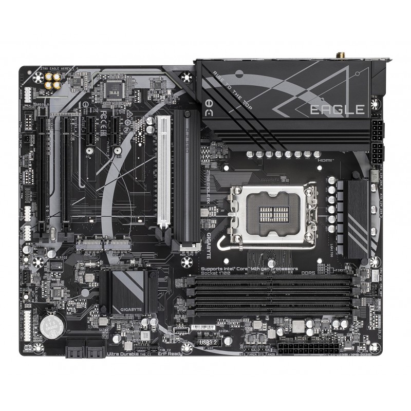 GIGABYTE Z790 EAGLE AX Carte mère - Prend en charge les processeurs Intel Core de 14e génération, VRM numérique 12+1+1 phases, jusqu'à 7600 MHz DDR5 (OC), 3xPCIe 4.0 M.2, Wi-Fi 6E, LAN 2.5GbE, USB 3.2 Gen 2. Fabricant de processeur: Intel, Socket de processeur (réceptable de processeur): LGA 1700, Processeurs compatibles: Intel® Celeron®, Intel® Core™ i3, Intel® Core™ i5, Intel® Core™ i7, Intel® Core™ i9,.... Types de mémoire pris en charge: DDR5-SDRAM, Mémoire interne maximale: 192 Go, Type de support (slot): DIMM. Interfaces de lecteur de stockage prises en charge: M.2, SATA III, Types de lecteurs de stockage pris en charge: HDD & SSD, Niveaux RAID: 0, 1, 5, 10. Résolution maximale: 4096 x 2304 pixels. Connecteur USB: USB Type-A, USB Type-C