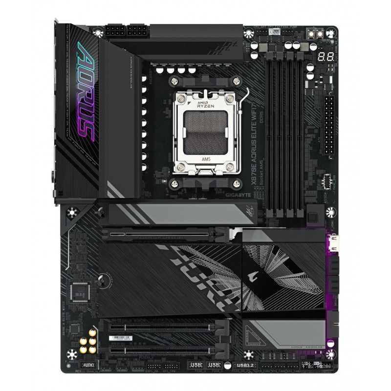 GIGABYTE X870E AORUS ELITE WIFI7 Carte Mère - Prend en charge les processeurs AMD Ryzen 9000, 16+2+2 phases VRM numérique, jusqu'à 8000Hz DDR5 (OC), 3xPCIe 5.0 + 1xPCIe 4.0, Wi-Fi 7, LAN 2,5GbE, USB 4. Fabricant de processeur: AMD, Socket de processeur (réceptable de processeur): Emplacement AM5, Processeurs compatibles: AMD Ryzen 7000 Series, AMD Ryzen 8000 Series, AMD Ryzen 9000 Series. Types de mémoire pris en charge: DDR5-SDRAM, Mémoire interne maximale: 256 Go, Type de support (slot): DIMM. Interfaces de lecteur de stockage prises en charge: M.2, SATA III, Types de lecteurs de stockage pris en charge: HDD & SSD, Niveaux RAID: 0, 1, 10. Type d'interface Ethernet: 2.5 Gigabit Ethernet, Contrôleur de réseau local (LAN): Realtek RTL8125, Norme Wi-Fi: Wi-Fi 7 (802.11be). composant pour: PC, Elément de forme de carte mère: ATX, famille de composant de produits: AMD