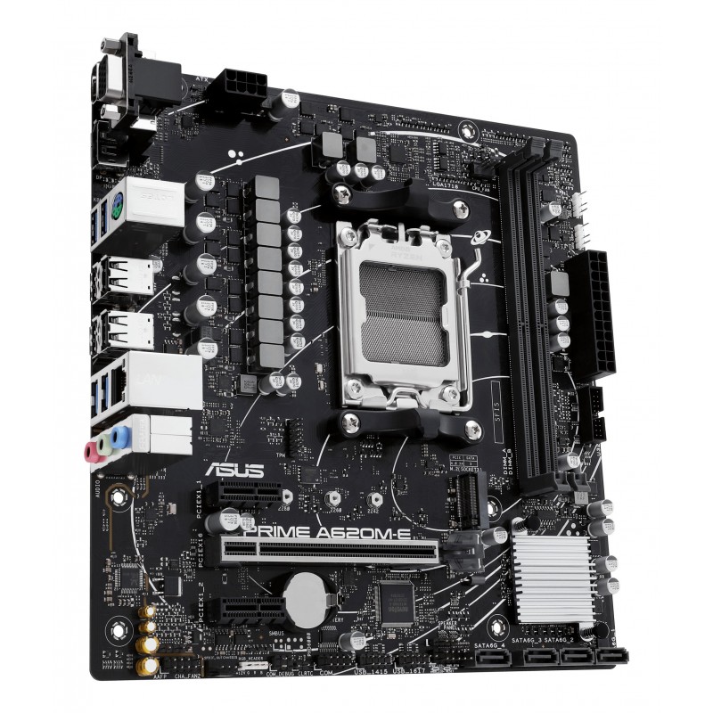 ASUS PRIME A620M-E-CSM. Fabricant de processeur: AMD, Socket de processeur (réceptable de processeur): Emplacement AM5, Processeurs compatibles: AMD Ryzen 7000 Series. Types de mémoire pris en charge: DDR5-SDRAM, Mémoire interne maximale: 96 Go, Type de support (slot): DIMM. Interfaces de lecteur de stockage prises en charge: M.2, SATA III, Types de lecteurs de stockage pris en charge: HDD & SSD, Niveaux RAID: 0, 1, 10. Type d'interface Ethernet: Gigabit Ethernet. composant pour: PC, Elément de forme de carte mère: micro ATX, famille de composant de produits: AMD