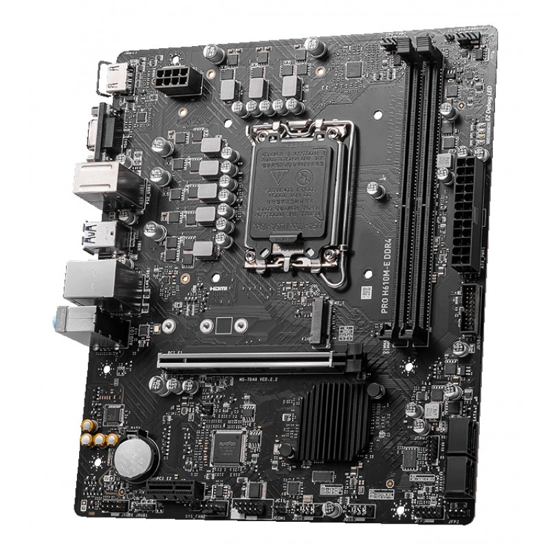 MSI PRO H610M-E DDR4. Fabricant de processeur: Intel, Socket de processeur (réceptable de processeur): LGA 1700, Processeurs compatibles: Intel® Core™ i9. Types de mémoire pris en charge: DDR4-SDRAM, Mémoire interne maximale: 64 Go, Type de support (slot): DIMM. Interfaces de lecteur de stockage prises en charge: M.2, SATA III, Types de lecteurs de stockage pris en charge: HDD & SSD. Type d'interface Ethernet: Gigabit Ethernet. composant pour: PC, Elément de forme de carte mère: micro ATX, famille de composant de produits: Intel