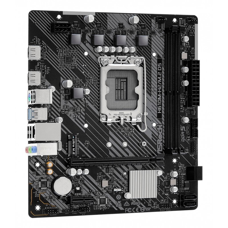 Asrock H610M-H2/M.2 D5. Fabricant de processeur: Intel, Socket de processeur (réceptable de processeur): LGA 1700. Types de mémoire pris en charge: DDR5-SDRAM, Mémoire interne maximale: 96 Go, Type de support (slot): DIMM. Interfaces de lecteur de stockage prises en charge: M.2, SATA III. Type d'interface Ethernet: Gigabit Ethernet, Contrôleur de réseau local (LAN): Realtek 8111H. composant pour: PC, Elément de forme de carte mère: micro ATX, famille de composant de produits: Intel
