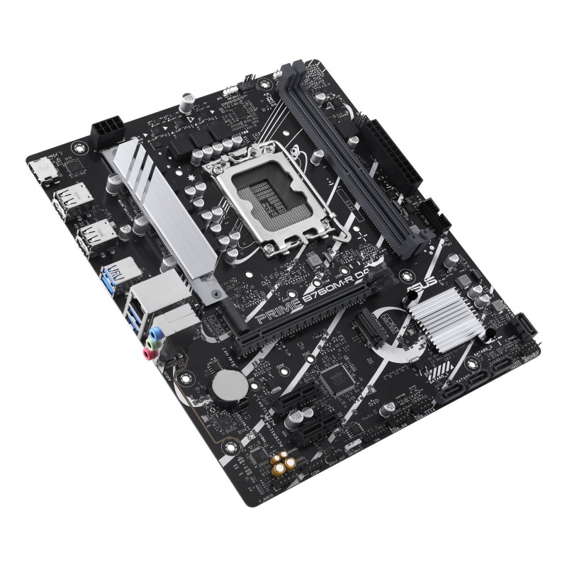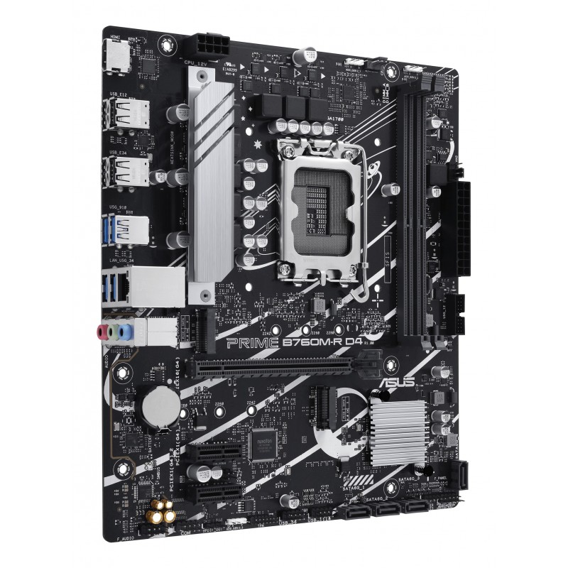 ASUS PRIME B760M-R D4. Fabricant de processeur: Intel, Socket de processeur (réceptable de processeur): LGA 1700, Processeurs compatibles: Intel Core i9 14th Gen, Intel Core i3 12th Gen, Intel Core i3 13th Gen, Intel Core i5 12th Gen,.... Types de mémoire pris en charge: DDR4-SDRAM, Mémoire interne maximale: 64 Go, Type de support (slot): DIMM. Interfaces de lecteur de stockage prises en charge: M.2, SATA III, Types de lecteurs de stockage pris en charge: HDD & SSD, Niveaux RAID: 0, 1, 5, 10. Type d'interface Ethernet: 2.5 Gigabit Ethernet. composant pour: PC, Elément de forme de carte mère: micro ATX, famille de composant de produits: Intel