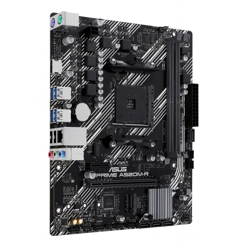 ASUS PRIME A520M-R. Fabricant de processeur: AMD, Socket de processeur (réceptable de processeur): Emplacement AM4, Processeurs compatibles: AMD Ryzen 3000 Series, AMD Ryzen 5000 Series. Types de mémoire pris en charge: DDR5-SDRAM, Mémoire interne maximale: 64 Go, Type de support (slot): DIMM. Interfaces de lecteur de stockage prises en charge: M.2, SATA III, Types de lecteurs de stockage pris en charge: HDD & SSD, Niveaux RAID: 0, 1, 10. Type d'interface Ethernet: Gigabit Ethernet. composant pour: PC, Elément de forme de carte mère: micro ATX, famille de composant de produits: AMD