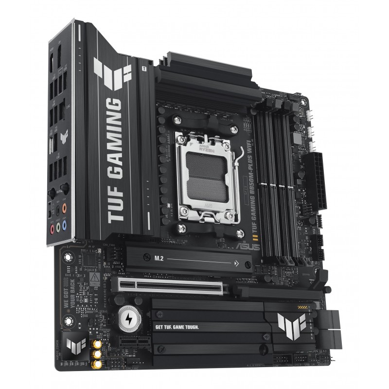 ASUS TUF GAMING B850M-PLUS WIFI. Fabricant de processeur: AMD, Socket de processeur (réceptable de processeur): Emplacement AM5, Processeurs compatibles: AMD Ryzen 7000 Series, AMD Ryzen 8000 Series, AMD Ryzen 9000 Series. Types de mémoire pris en charge: DDR5-SDRAM, Mémoire interne maximale: 192 Go, Type de support (slot): DIMM. Interfaces de lecteur de stockage prises en charge: M.2, SATA III, Types de lecteurs de stockage pris en charge: HDD & SSD, Niveaux RAID: 0, 1, 5, 10. Type d'interface Ethernet: 2.5 Gigabit Ethernet, Norme Wi-Fi: Wi-Fi 6E (802.11ax), Standards wifi: Wi-Fi 6E (802.11ax). composant pour: PC, Elément de forme de carte mère: micro ATX, famille de composant de produits: AMD