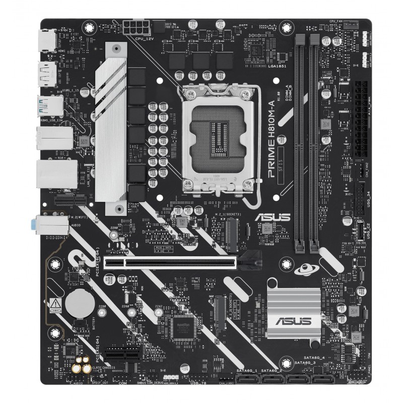 ASUS PRIME H810M-A-CSM. Fabricant de processeur: Intel, Socket de processeur (réceptable de processeur): LGA 1851 (Socket V1), Processeurs compatibles: Intel Core Ultra (Series 2). Types de mémoire pris en charge: DDR5-SDRAM, Mémoire interne maximale: 128 Go, Type de support (slot): DIMM. Interfaces de lecteur de stockage prises en charge: M.2, PCI Express 4.0, SATA III, Types de lecteurs de stockage pris en charge: HDD & SSD. Type d'interface Ethernet: Gigabit Ethernet, Contrôleur de réseau local (LAN): Intel I219V. composant pour: PC, Elément de forme de carte mère: micro ATX, famille de composant de produits: Intel