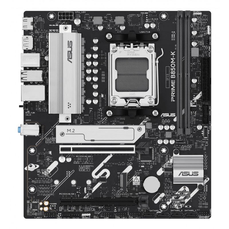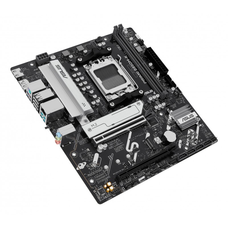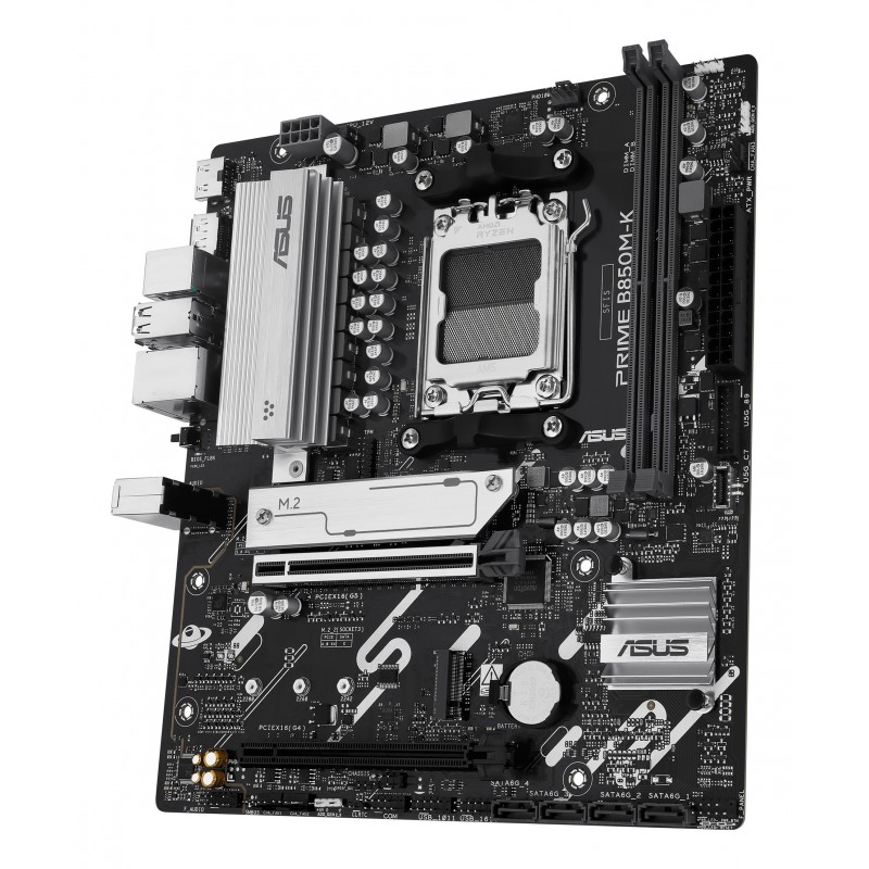 ASUS PRIME B850M-K. Fabricant de processeur: AMD, Socket de processeur (réceptable de processeur): Emplacement AM5, Processeurs compatibles: AMD Ryzen 7000 Series, AMD Ryzen 8000 Series, AMD Ryzen 9000 Series. Types de mémoire pris en charge: DDR5-SDRAM, Mémoire interne maximale: 128 Go, Type de support (slot): DIMM. Interfaces de lecteur de stockage prises en charge: M.2, SATA III, Types de lecteurs de stockage pris en charge: HDD & SSD, Niveaux RAID: 0, 1, 5, 10. Type d'interface Ethernet: 2.5 Gigabit Ethernet. composant pour: PC, Elément de forme de carte mère: micro ATX, famille de composant de produits: AMD