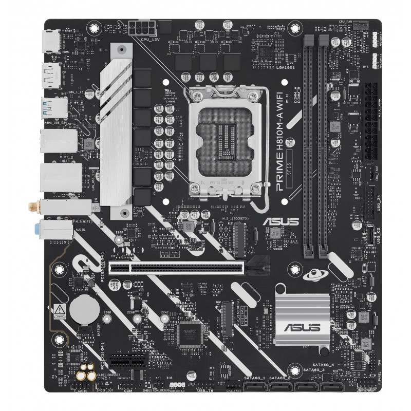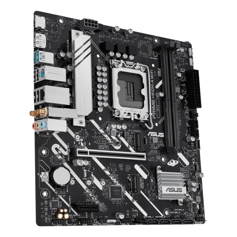 ASUS PRIME H810M-A WIFI. Fabricant de processeur: Intel, Socket de processeur (réceptable de processeur): LGA 1851 (Socket V1), Processeurs compatibles: Intel Core Ultra (Series 2). Types de mémoire pris en charge: DDR5-SDRAM, Mémoire interne maximale: 128 Go, Type de support (slot): DIMM. Interfaces de lecteur de stockage prises en charge: M.2, SATA III, Types de lecteurs de stockage pris en charge: HDD & SSD, Niveaux RAID: 0, 1, 5, 10. Type d'interface Ethernet: Gigabit Ethernet, Norme Wi-Fi: Wi-Fi 6 (802.11ax), Standards wifi: Wi-Fi 6 (802.11ax). composant pour: PC, Elément de forme de carte mère: micro ATX, famille de composant de produits: Intel