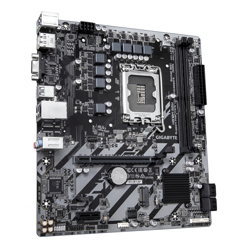 GIGABYTE H810M S2H Carte mère - Processeurs Intel Core Ultra (Série 2), VRM 4+1+2 phases, jusqu'à 6400 MHz DDR5, 1xPCIe 4.0 M.2, LAN 1GbE, USB 3.2 Gen 1. Fabricant de processeur: Intel, Socket de processeur (réceptable de processeur): LGA 1851 (Socket V1), Processeurs compatibles: Intel Core Ultra (Series 2). Types de mémoire pris en charge: DDR5-SDRAM, Mémoire interne maximale: 128 Go, Type de support (slot): DIMM. Interfaces de lecteur de stockage prises en charge: M.2, PCI Express 4.0, SATA III, Types de lecteurs de stockage pris en charge: HDD & SSD, Niveaux RAID: 0, 1, 5, 10. Résolution maximale: 4096 x 2160 pixels. Type d'interface Ethernet: Gigabit Ethernet, Contrôleur de réseau local (LAN): Realtek RTL8111H