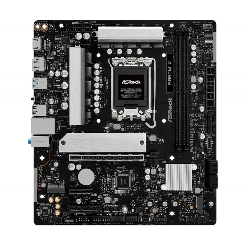 Asrock B860M-X. Fabricant de processeur: Intel, Socket de processeur (réceptable de processeur): LGA 1851 (Socket V1), Processeurs compatibles: Intel Core Ultra (Series 2). Types de mémoire pris en charge: DDR5-SDRAM, Mémoire interne maximale: 128 Go, Type de support (slot): DIMM. Interfaces de lecteur de stockage prises en charge: M.2, SATA III, Types de lecteurs de stockage pris en charge: HDD & SSD, Niveaux RAID: 0, 1, 5, 10. Type d'interface Ethernet: 2.5 Gigabit Ethernet, Contrôleur de réseau local (LAN): Dragon RTL8125BG. composant pour: PC, Elément de forme de carte mère: micro ATX, famille de composant de produits: Intel