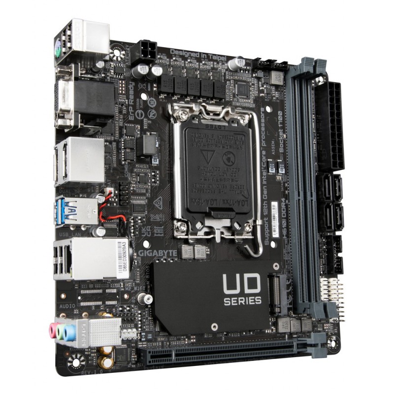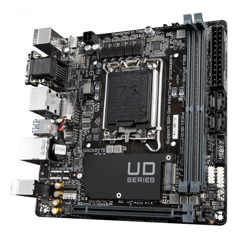 GIGABYTE H610I DDR4 Carte mère - Compatible avec processeurs Intel Core 14th CPUs, 4+1+1 Hybrid Digital VRM, up to 3200MHz DDR4, 1xPCIe 3.0 M.2, GbE LAN, USB 3.2 Gen 1. Fabricant de processeur: Intel, Socket de processeur (réceptable de processeur): LGA 1700, Processeurs compatibles: Intel® Celeron®, Intel® Core™ i3, Intel® Core™ i5, Intel® Core™ i7, Intel® Core™ i9,.... Types de mémoire pris en charge: DDR4-SDRAM, Mémoire interne maximale: 64 Go, Type de support (slot): DIMM. Interfaces de lecteur de stockage prises en charge: M.2, SATA III, Types de lecteurs de stockage pris en charge: HDD & SSD. Résolution maximale: 4096 x 2304 pixels. Connecteur USB: USB Type-A