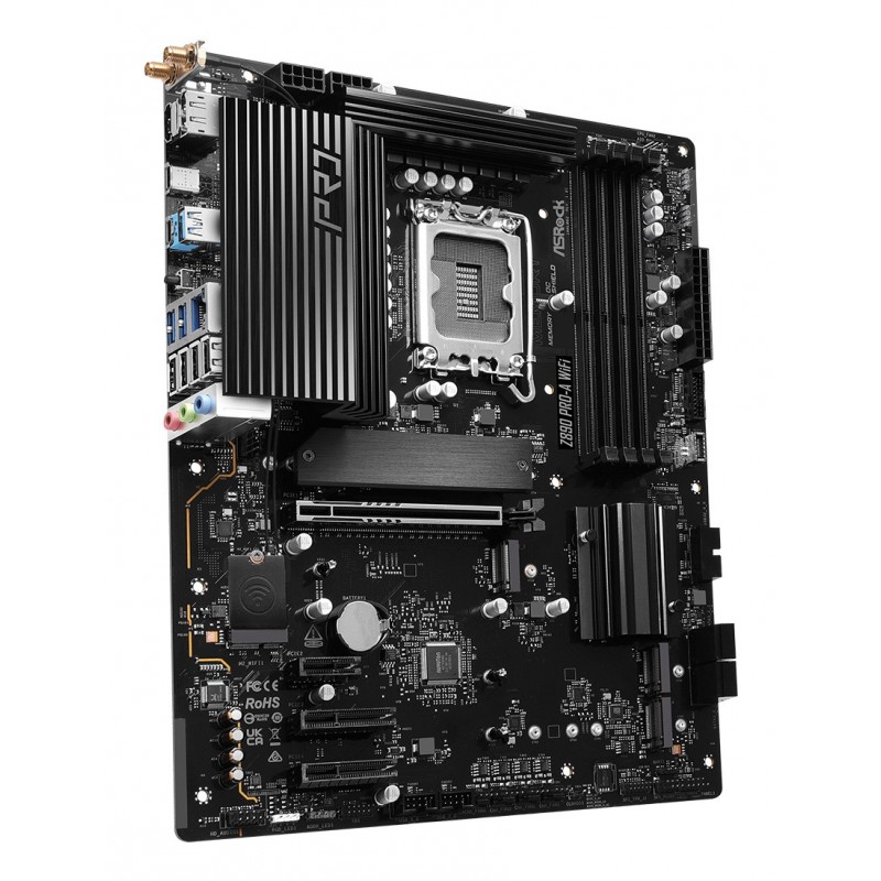 Asrock Z890 Pro-A WiFi. Fabricant de processeur: Intel, Socket de processeur (réceptable de processeur): LGA 1851 (Socket V1), Processeurs compatibles: Intel Core Ultra (Series 2). Types de mémoire pris en charge: DDR5-SDRAM, Mémoire interne maximale: 256 Go, Type de support (slot): DIMM. Interfaces de lecteur de stockage prises en charge: M.2, SATA III, Types de lecteurs de stockage pris en charge: HDD & SSD, Niveaux RAID: 0, 1, 5, 10. Type d'interface Ethernet: 2.5 Gigabit Ethernet, Contrôleur de réseau local (LAN): Dragon RTL8125BG, Norme Wi-Fi: Wi-Fi 6E (802.11ax). composant pour: PC, Elément de forme de carte mère: ATX, famille de composant de produits: Intel