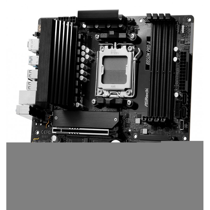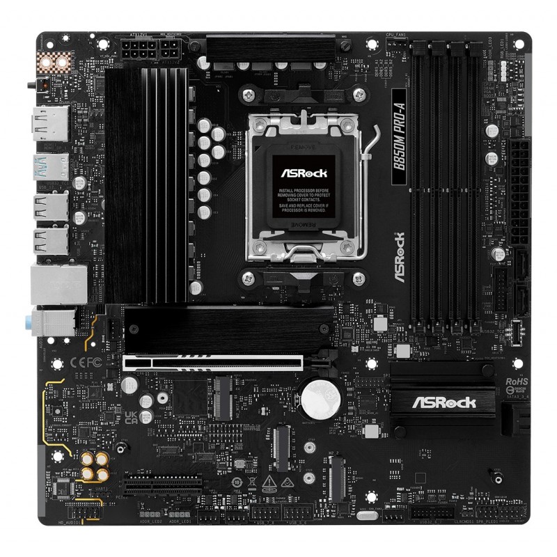 Asrock B850M Pro-A. Fabricant de processeur: AMD, Socket de processeur (réceptable de processeur): Emplacement AM5, Processeurs compatibles: AMD Ryzen 7000 Series, AMD Ryzen 8000 Series, AMD Ryzen 9000 Series. Types de mémoire pris en charge: DDR5-SDRAM, Mémoire interne maximale: 256 Go, Type de support (slot): DIMM. Interfaces de lecteur de stockage prises en charge: PCI Express 4.0, PCI Express 5.0, SATA III, Types de lecteurs de stockage pris en charge: HDD & SSD, Niveaux RAID: 0, 1, 10. Résolution maximale: 3840 x 2160 pixels. Connecteur USB: USB Type-A, USB Type-C