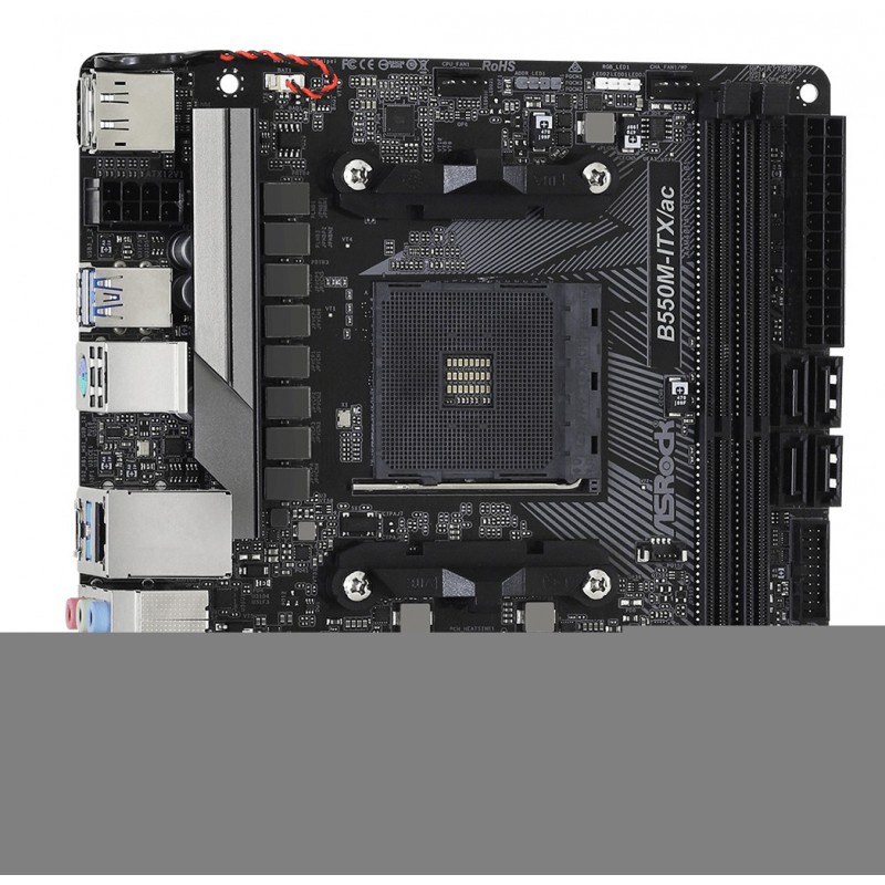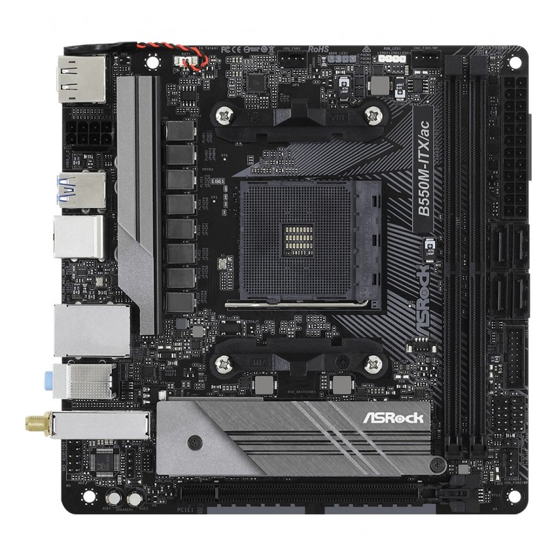 Asrock B550M-ITX/ac. Fabricant de processeur: AMD, Socket de processeur (réceptable de processeur): Emplacement AM4, Processeurs compatibles: AMD Ryzen 3000 Series. Types de mémoire pris en charge: DDR4-SDRAM, Mémoire interne maximale: 64 Go, Type de support (slot): DIMM. Interfaces de lecteur de stockage prises en charge: M.2, SATA III. Famille d'adaptateur graphique: AMD, Adaptateur graphique: Radeon Vega. Type d'interface Ethernet: Gigabit Ethernet, Contrôleur de réseau local (LAN): Realtek RTL8111H, Standards wifi: 802.11a, 802.11b, 802.11g, Wi-Fi 4 (802.11n), Wi-Fi 5 (802.11ac)