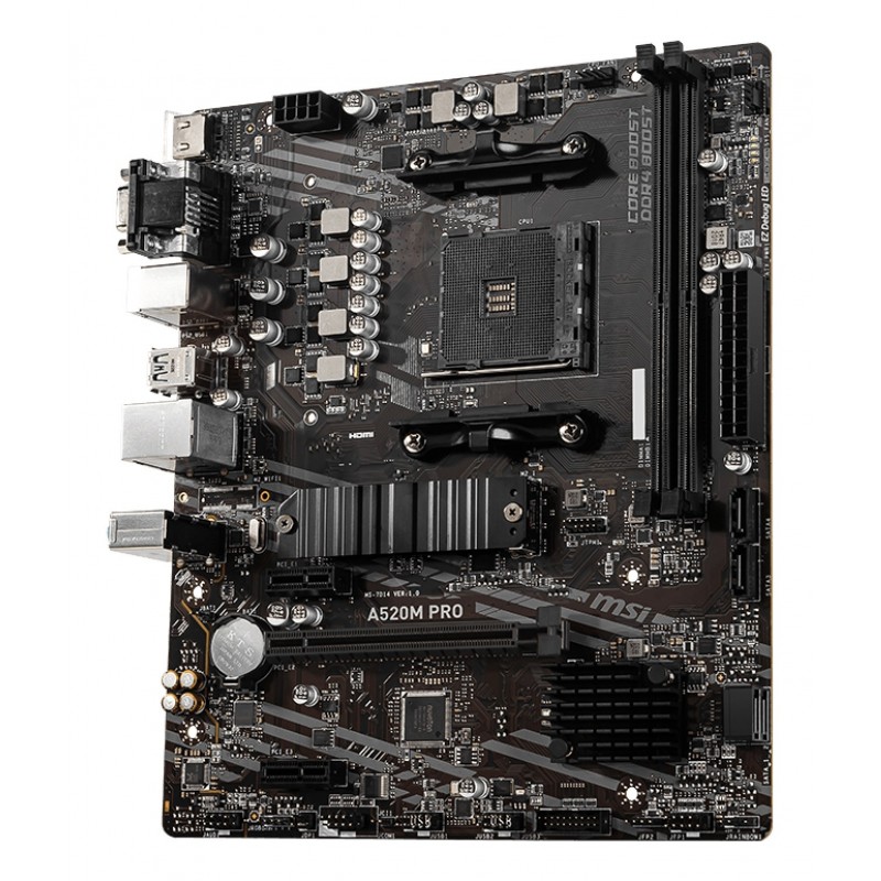 MSI A520M PRO. Fabricant de processeur: AMD, Socket de processeur (réceptable de processeur): Emplacement AM4, Processeurs compatibles: AMD Ryzen 3000 Series. Types de mémoire pris en charge: DDR4-SDRAM, Mémoire interne maximale: 64 Go, Type de support (slot): DIMM. Interfaces de lecteur de stockage prises en charge: PCI Express 3.0, SATA, Types de lecteurs de stockage pris en charge: HDD & SSD, Niveaux RAID: 0, 1, 10. Résolution maximale: 4096 x 2160 pixels. Type d'interface Ethernet: Gigabit Ethernet, Contrôleur de réseau local (LAN): Realtek 8111H