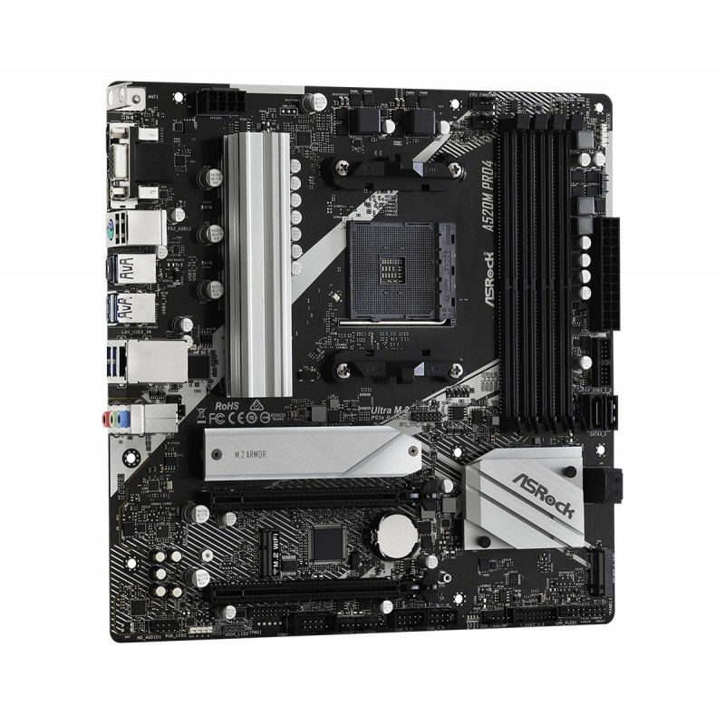 Asrock A520M Pro4. Fabricant de processeur: AMD, Socket de processeur (réceptable de processeur): Emplacement AM4, Processeurs compatibles: AMD Ryzen 3000 Series. Types de mémoire pris en charge: DDR4-SDRAM, Mémoire interne maximale: 64 Go, Type de support (slot): DIMM. Interfaces de lecteur de stockage prises en charge: M.2, SATA III. Famille d'adaptateur graphique: AMD, Adaptateur graphique: Radeon Vega. Type d'interface Ethernet: Gigabit Ethernet, Contrôleur de réseau local (LAN): Realtek RTL8111H